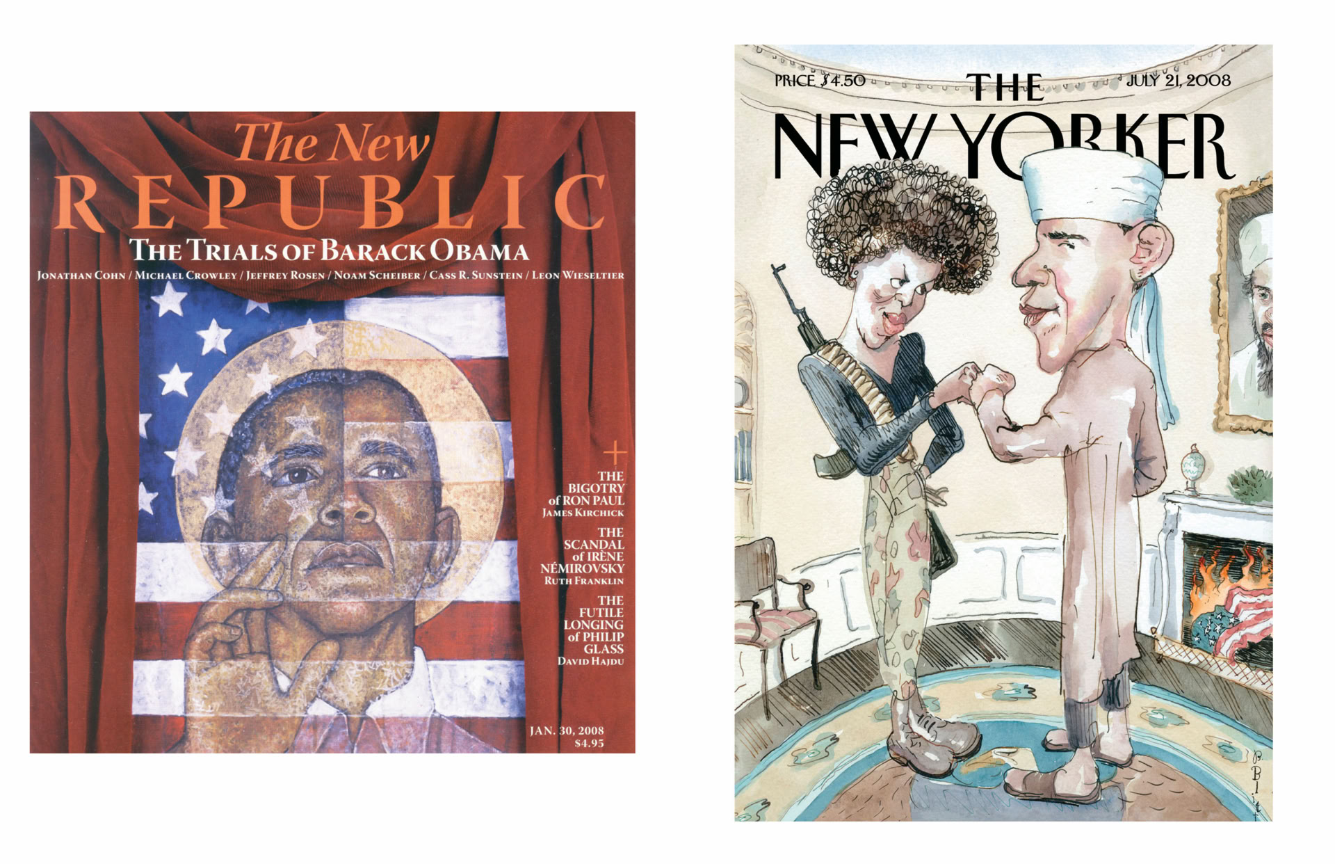 These diverse portrayals may have actually worked in Obama’s favour in getting him elected. Part of his winning appeal lay within the fact that he is a ‘morph’ of different elements — part black, part white, part statesman, part hip hopper, part Sidney Poitier, part Al Green. Some Obama covers adopted this theme of blending different visual elements. The ‘New Statesman’ (October 12, 2009), and ‘The New Republic’ (March 2008), presented variations of Obama “face-melds”. The New Statesman created a fusion of the faces of Obama and George W. Bush. The ears are those of Bush, but the eyes are Obama’s, although the finished face resembles someone of Middle-Eastern origin. It could be Obama’s cousin or Bush’s long-lost brother. The ‘New Republic’s rendition, created by artist Nancy Burson, features a fifty-fifty blend of Obama and Hillary Clinton. The image is a striking blend of man and woman, of black and white. The synthesis is serene, youthful and androgynous. The eyes look almost East Asian, while the mouth appears to be smiling slightly, like a modern-day Mona Lisa.