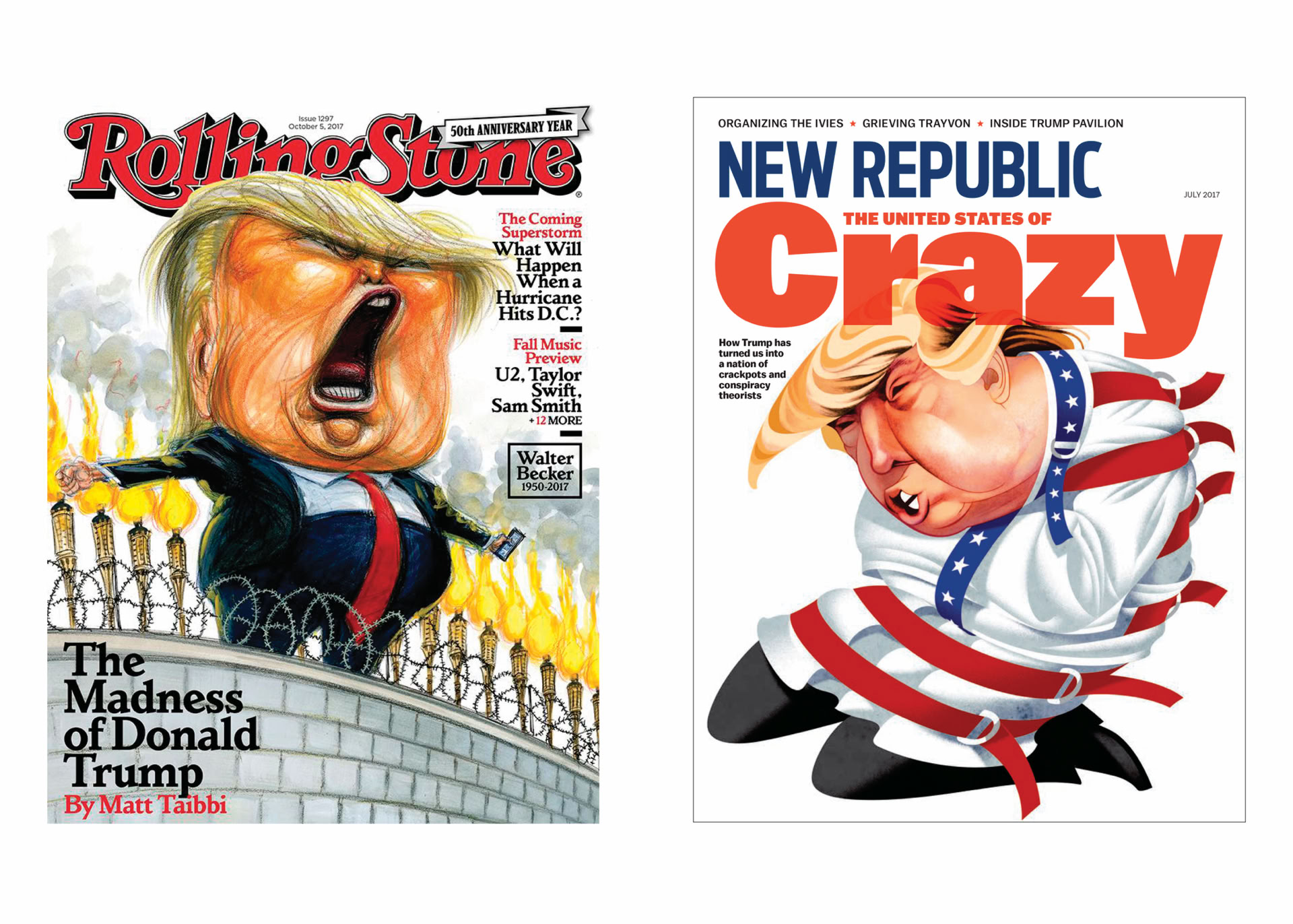 Ben Arogundade’s new book, ‘Fake Views? The Donald Trump Book Of Covers’, features 240 of the ex-US president’s best front pages, spanning 40 years in the public eye, including these examples from ‘Courrier International’ and ‘Newsweek’.