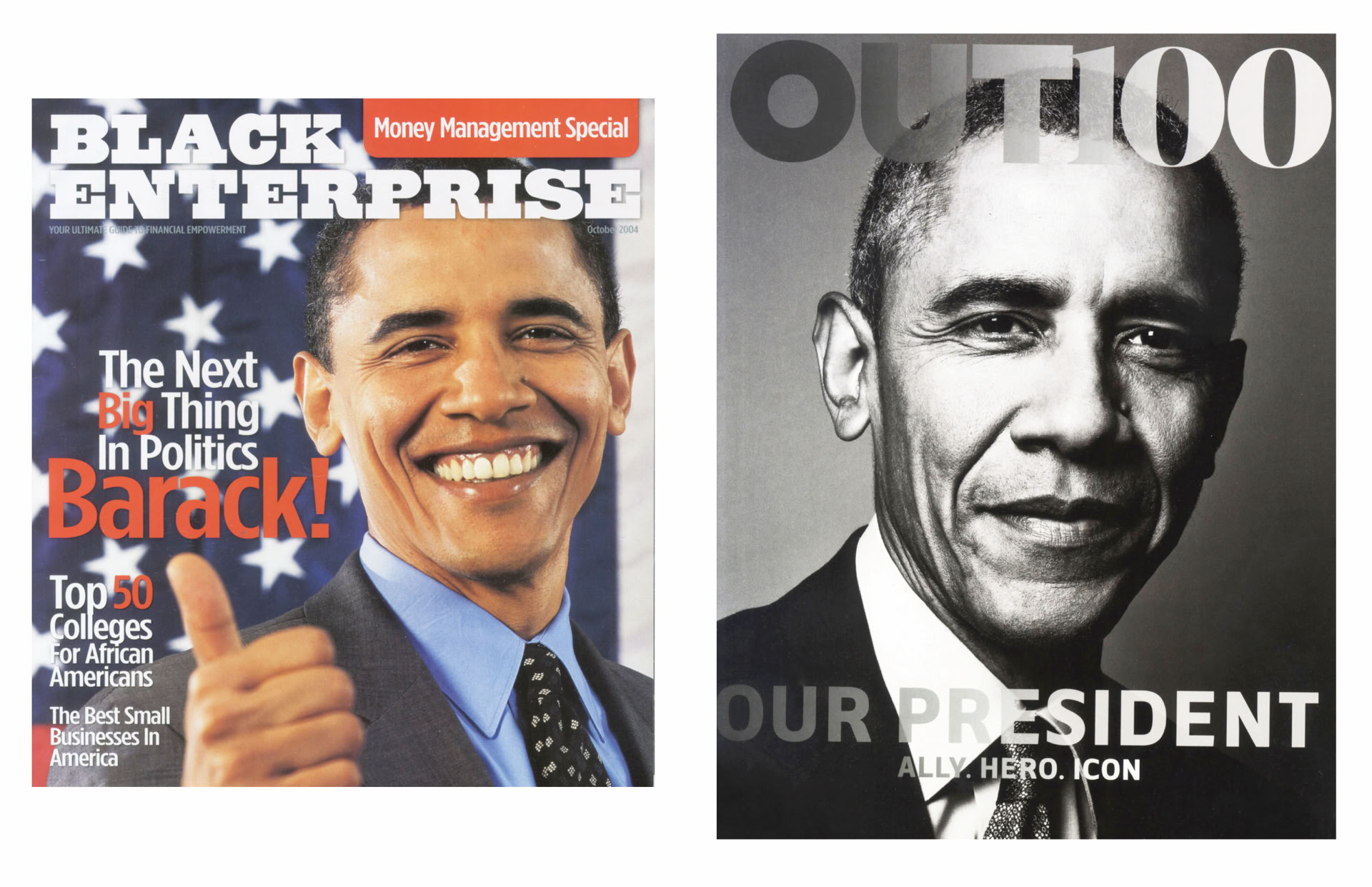 Ben Arogundade’s illustrated book, ‘Obama: 101 Best Covers’, features the ex-US president’s best front pages from his two terms in the White House, including these examples from ‘Black Enterprise’ and ‘OUT’.