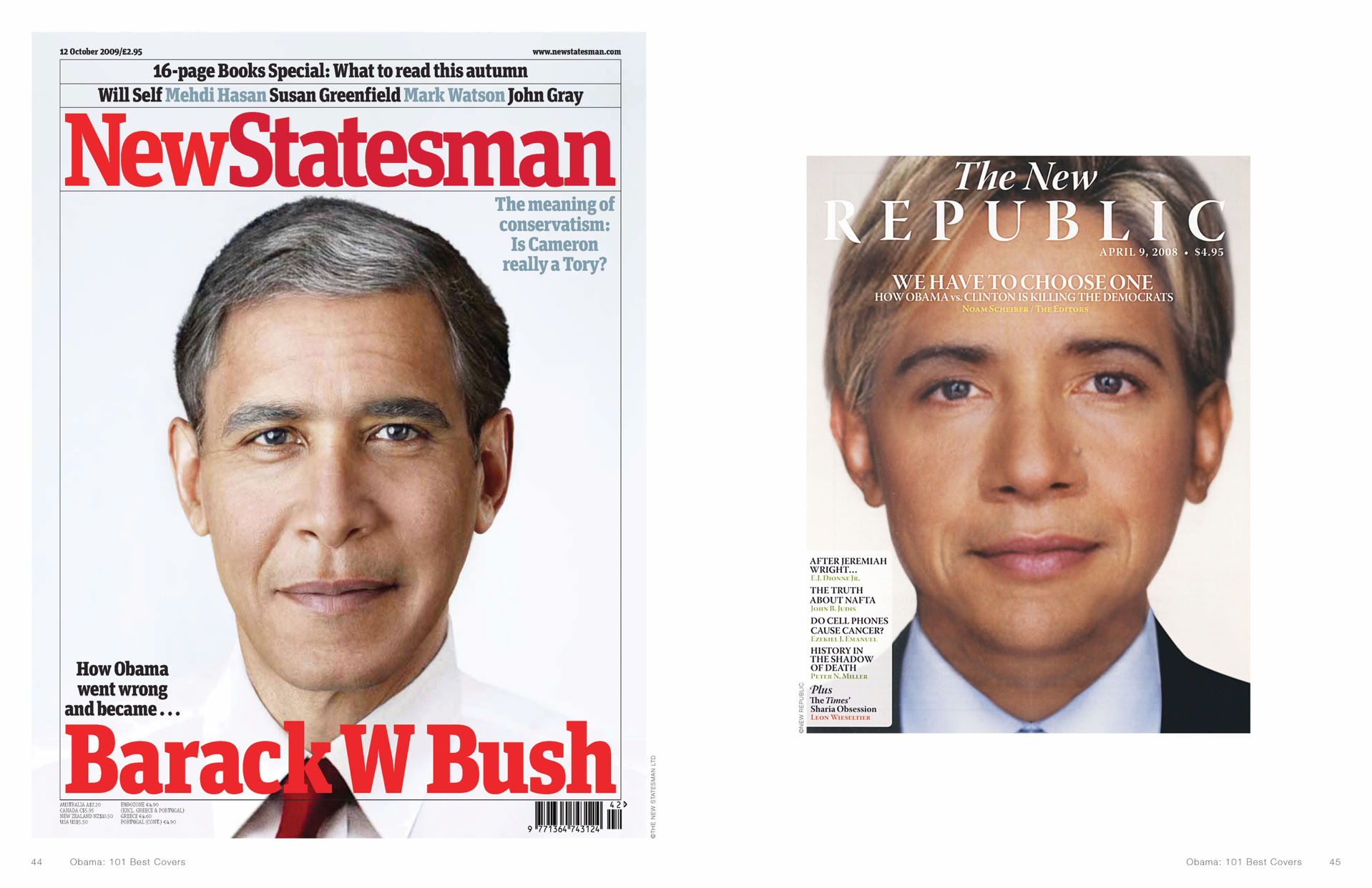 These diverse portrayals may have actually worked in Obama’s favour in getting him elected. Part of his winning appeal lay within the fact that he is a ‘morph’ of different elements — part black, part white, part statesman, part hip hopper, part Sidney Poitier, part Al Green. Some Obama covers adopted this theme of blending different visual elements. The ‘New Statesman’ (October 12, 2009), and ‘The New Republic’ (March 2008), presented variations of Obama “face-melds”. The New Statesman created a fusion of the faces of Obama and George W. Bush. The ears are those of Bush, but the eyes are Obama’s, although the finished face resembles someone of Middle-Eastern origin. It could be Obama’s cousin or Bush’s long-lost brother. The ‘New Republic’s rendition, created by artist Nancy Burson, features a fifty-fifty blend of Obama and Hillary Clinton. The image is a striking blend of man and woman, of black and white. The synthesis is serene, youthful and androgynous. The eyes look almost East Asian, while the mouth appears to be smiling slightly, like a modern-day Mona Lisa.