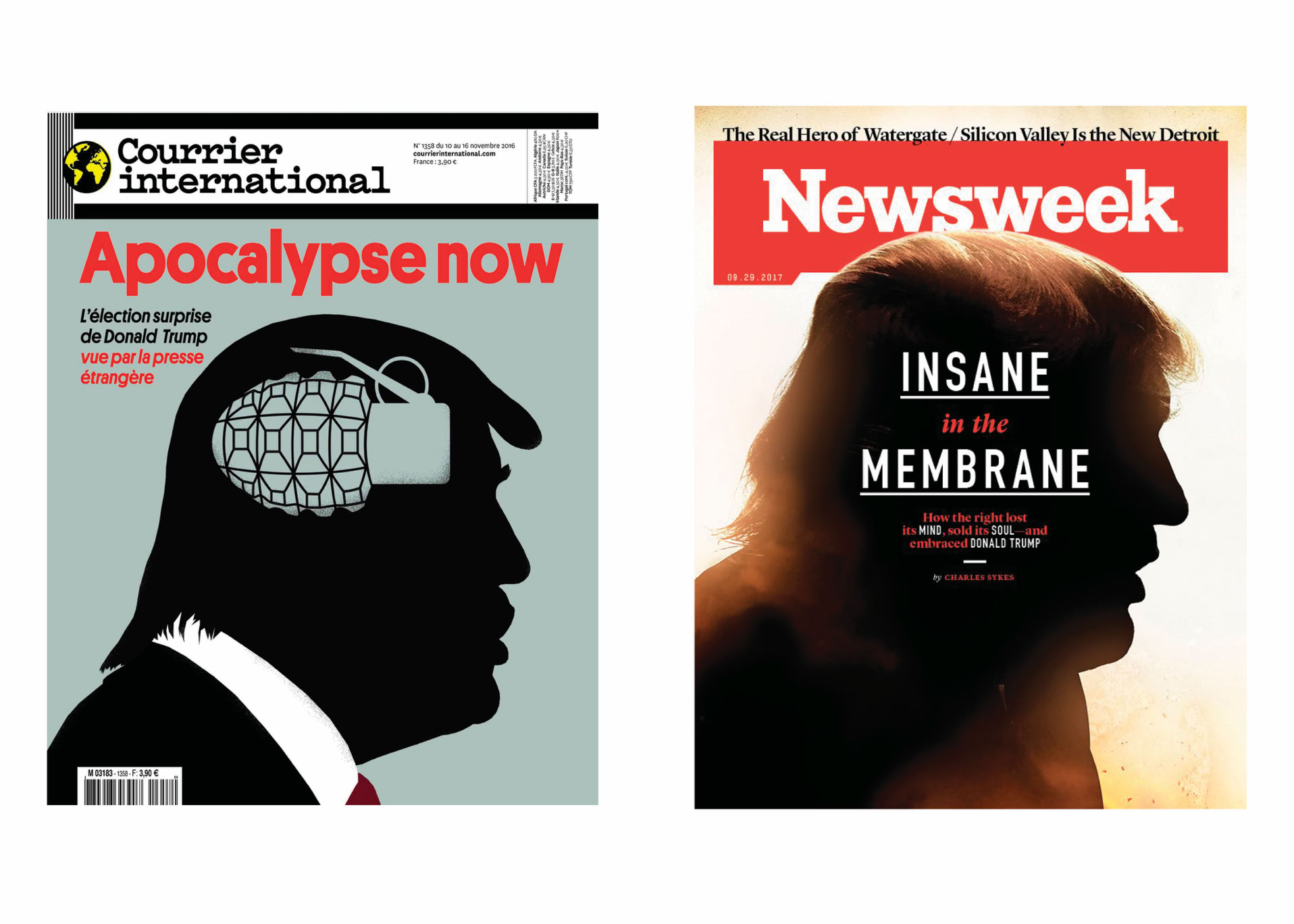 Ben Arogundade’s new book, ‘Fake Views? The Donald Trump Book Of Covers’, features 240 of the ex-US president’s best front pages, spanning 40 years in the public eye, including these examples from ‘Courrier International’ and ‘Newsweek’.
